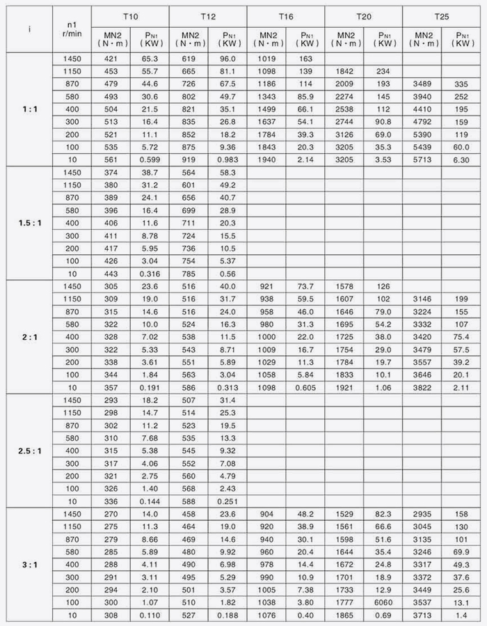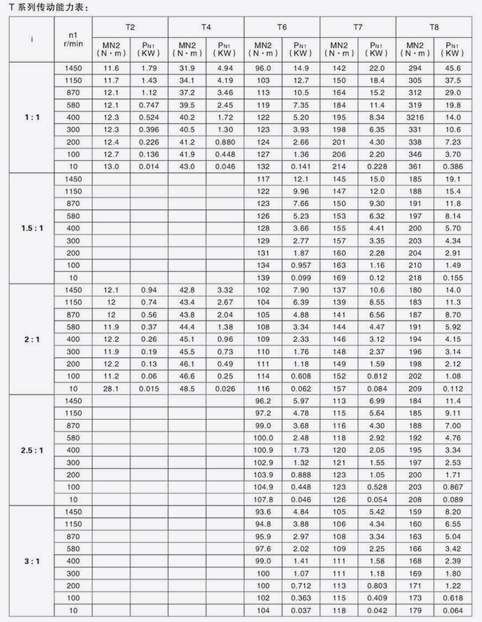 T系列螺旋傘齒輪轉向箱傳動能力表