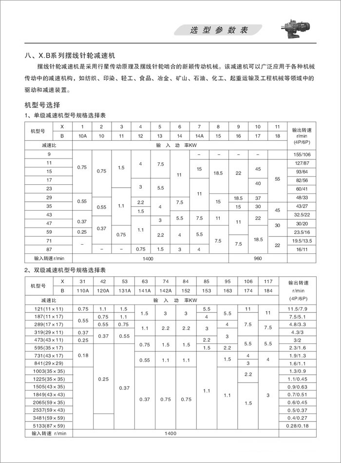 X/B系列單、雙級擺線減速機型號規格選型表