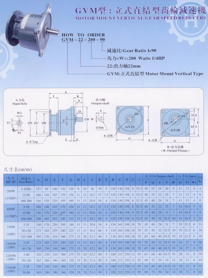GVM立式齒輪減速電機(jī)的型號(hào)表示方式,GVM立式小齒輪減速機(jī)馬達(dá)的外形尺寸表,GVM18,GVM22,GVM28,GVM32,GVM40,GVM50;75W(1/10HP),100W(1/8HP),200W(1/4HP),400W(1/2HP),750W(1HP),1500W(2HP),2200W(3HP),3700W(5HP)