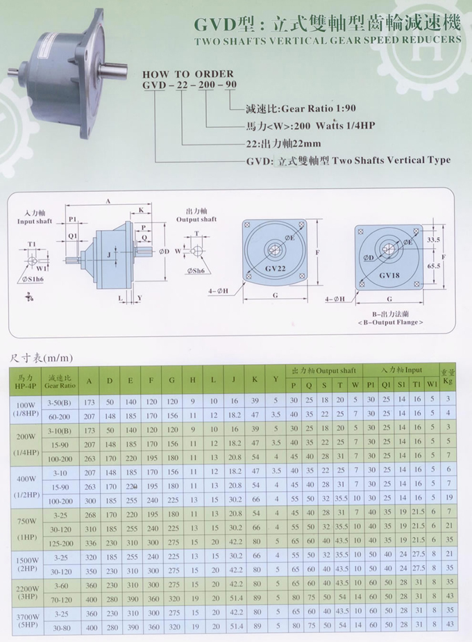 GVD立式齒輪減速電機(jī)的型號表示方式,GVD立式小齒輪減速機(jī)馬達(dá)的外形尺寸表,GVD18,GVD22,GVD28,GVD32,GVD40,GVD50;75W(1/10HP),100W(1/8HP),200W(1/4HP),400W(1/2HP),750W(1HP),1500W(2HP),2200W(3HP),3700W(5HP)